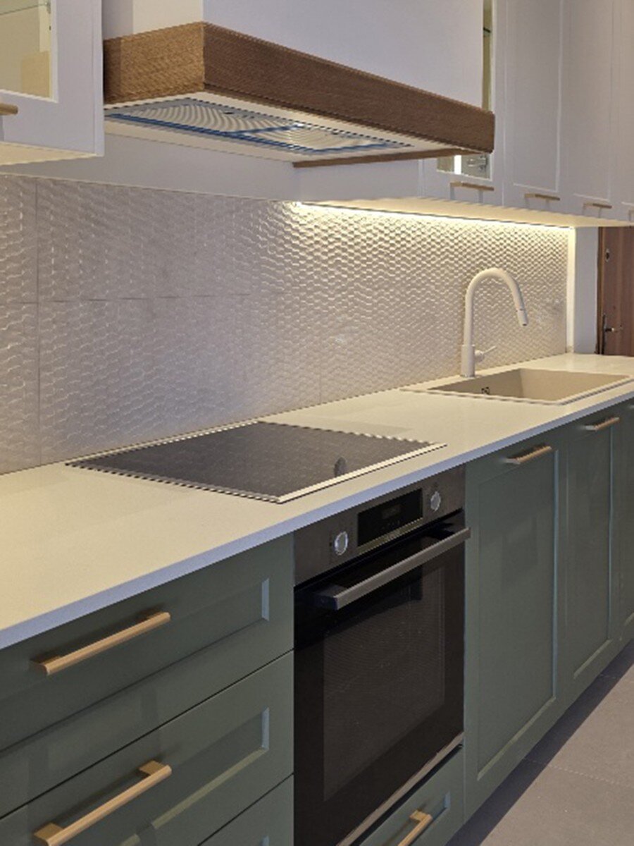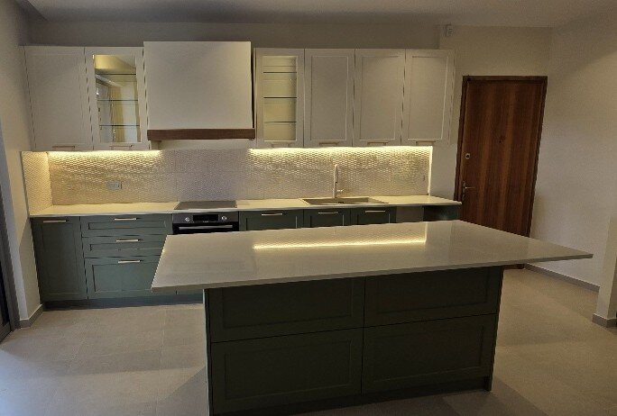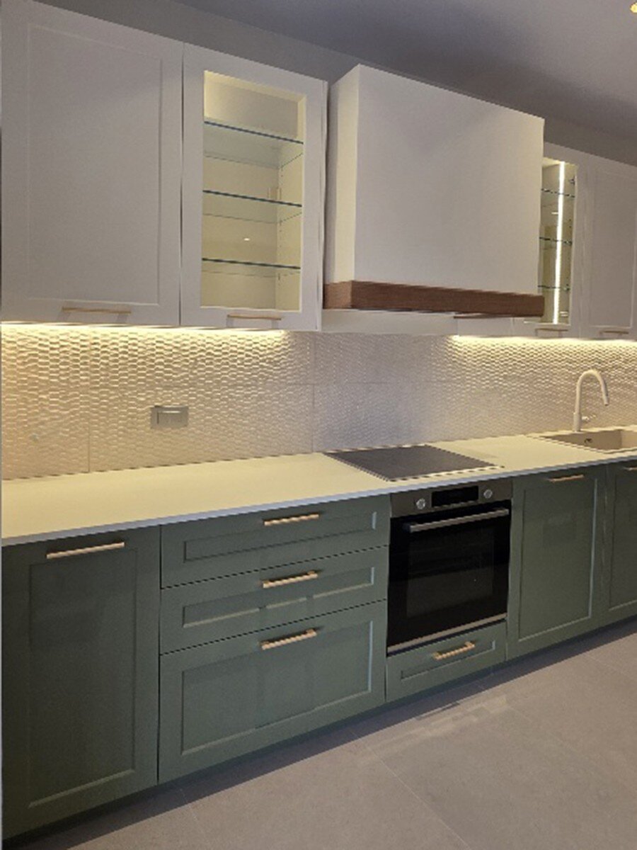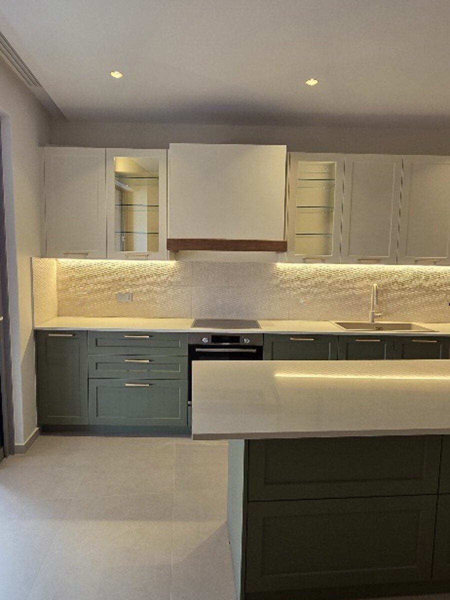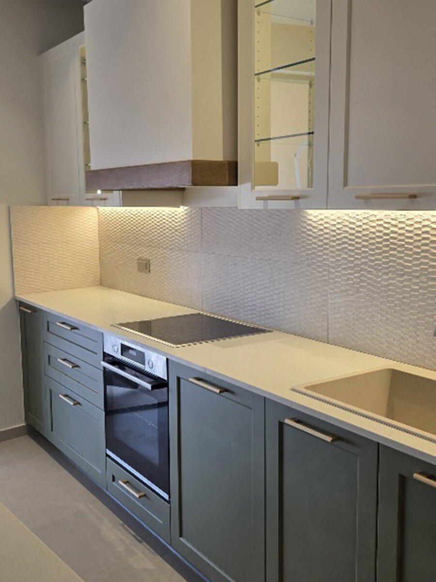 Έπιλα κουζίνας με minimal πορτάκι με κορνίζα βαμένο με διακοσμητική βαφή (Λάκα Γκοφρέ) που προσδίδει μια σαγρέ (ανάγλυφη) υφή σε ξύλινες επιφάνειες και έπιπλα, προσφέροντας αντοχή, κάλυψη ατελειών και αισθητική αναβάθμιση.