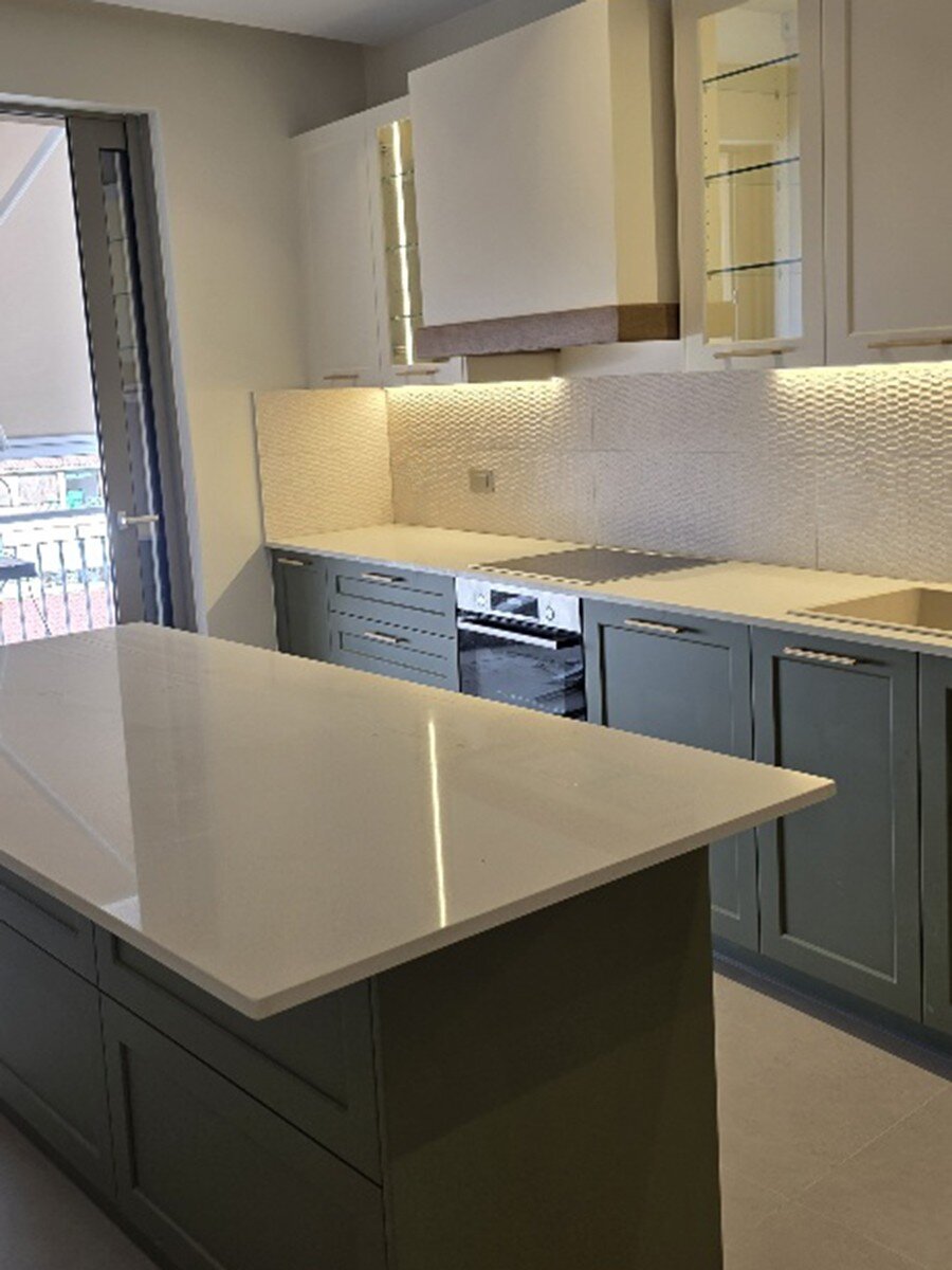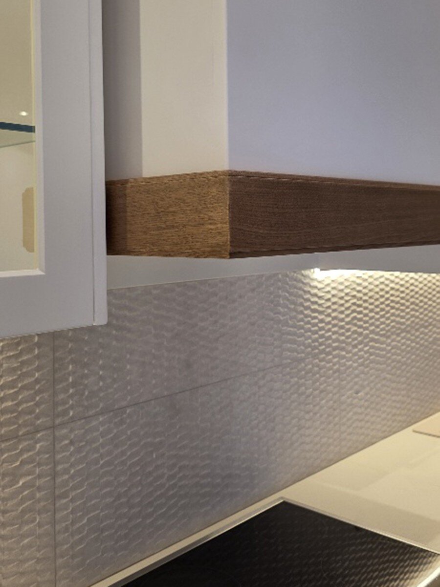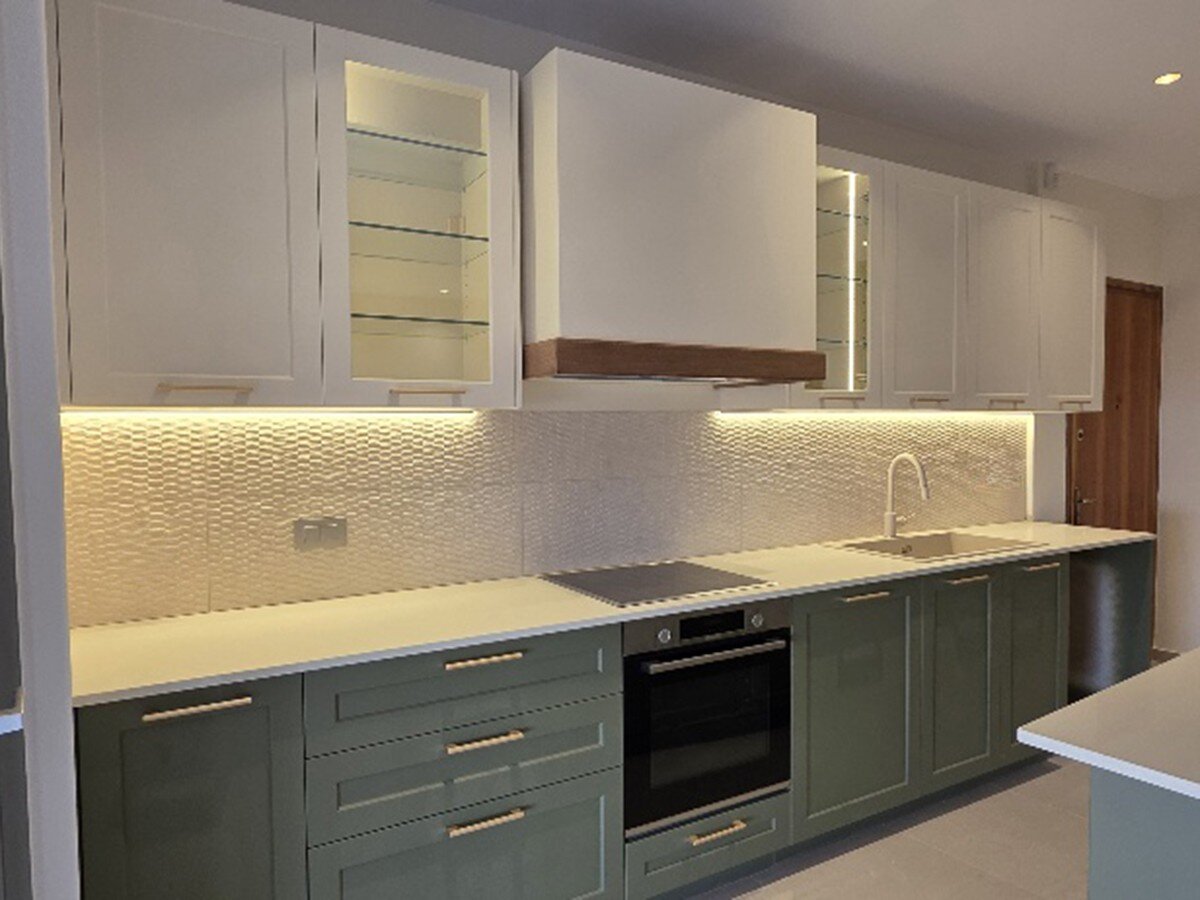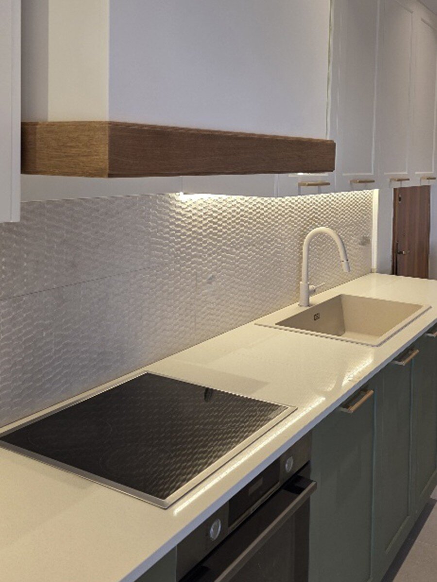 Έπιλα κουζίνας με minimal πορτάκι με κορνίζα βαμένο με διακοσμητική βαφή (Λάκα Γκοφρέ) που προσδίδει μια σαγρέ (ανάγλυφη) υφή σε ξύλινες επιφάνειες και έπιπλα, προσφέροντας αντοχή, κάλυψη ατελειών και αισθητική αναβάθμιση.